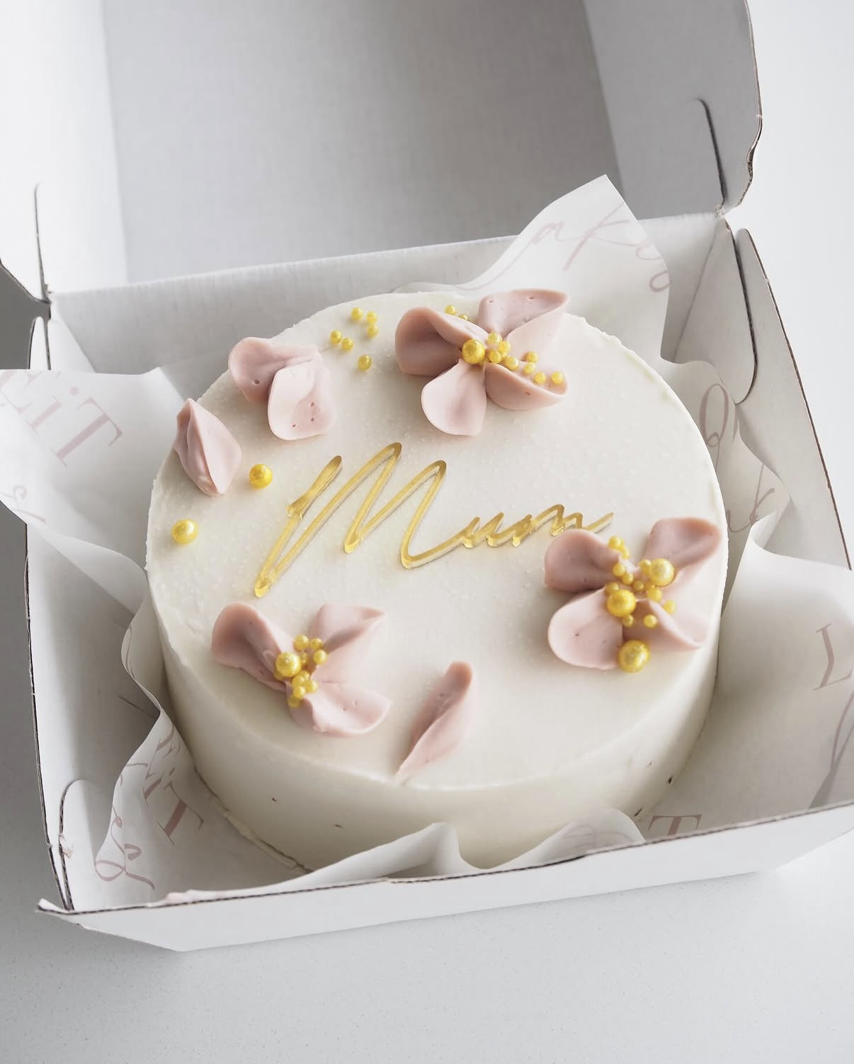 White buttercream , piped pink flowers , gold embellishments and an acrylic "Mum" Plaque. 3" diameter