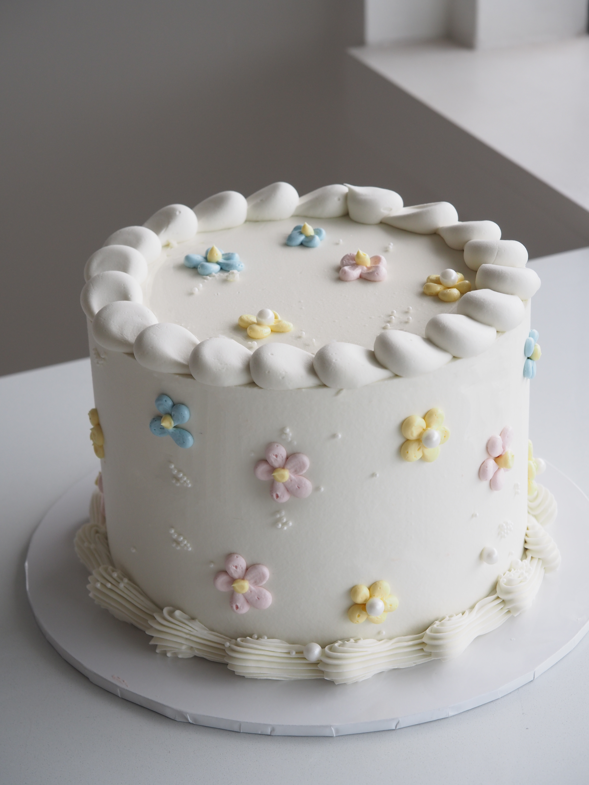 A smooth buttercream cake featuring hand piped flowers, edge piping and pearls.