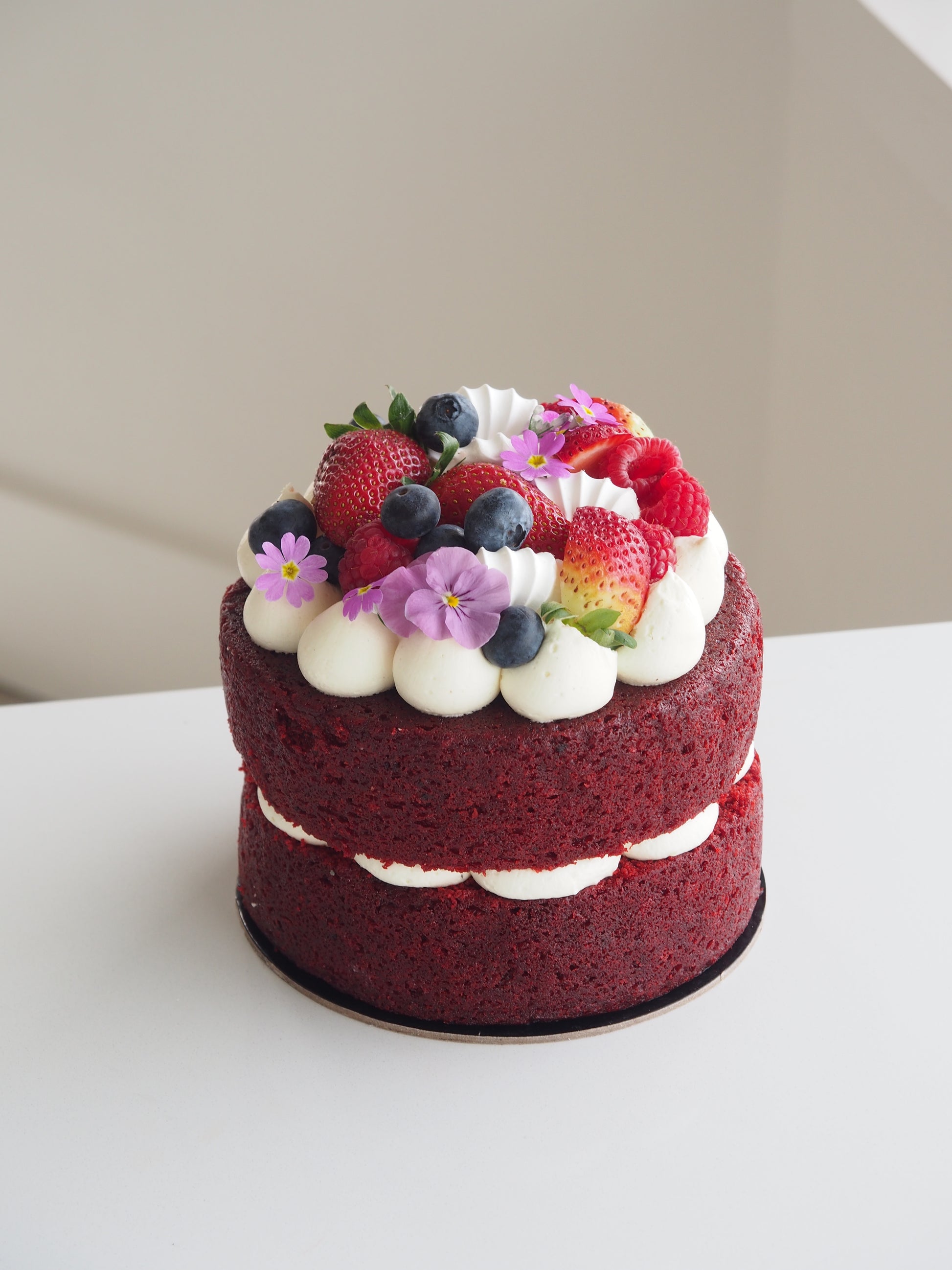 This cake is filled with cream cheese frosting and a raspberry sauce ,topped with fresh fruit and edible flowers.