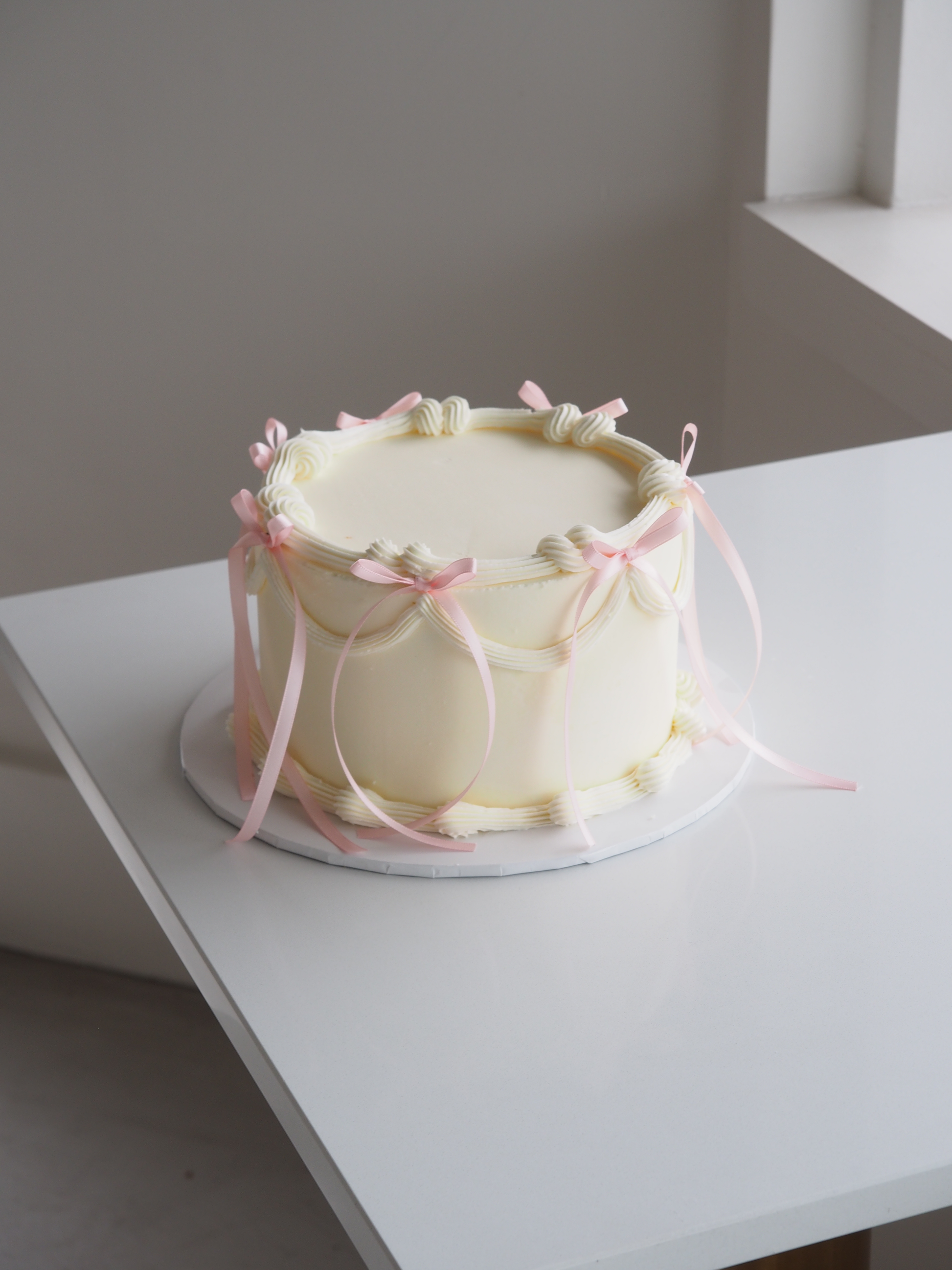 A two-layer round cake finished with smooth buttercream, elegant piping, and customisations. This cake is available in only three flavours, designed to be quick, efficient, and budget-friendly.